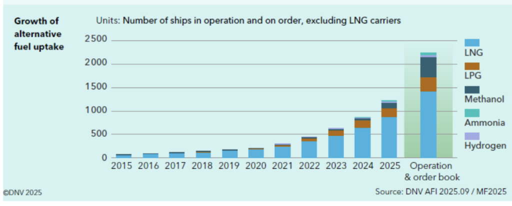 As laid out in the IMO’s 2023 strategy, the first major checkpoint – a 20% reduction in GHG emissions compared to 2008 levels – is already coming into view. While this might already appear overly ambitious to some, some clear results are already visible across the industry. DNV’s Alternative Fuels Insight (AFI) platform finds nearly 1,000 alternative-fuelled vessels operating as of 2025, and more than 1,100 more on order and set to enter operations by 2030. This clear shift in industry commitment and