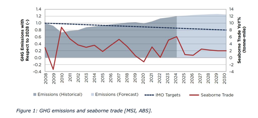 the 2030 emissions targets and in preparing for the steeper GHG reductions required thereafter. Historically, emissions declined between 2008 and 2013 (Figure 1), primarily due to reduced ship speeds following the 2008 global financial crisis (Figure 2), but rose again as trade volumes recovered, only partially offset by further moderate speed reductions.