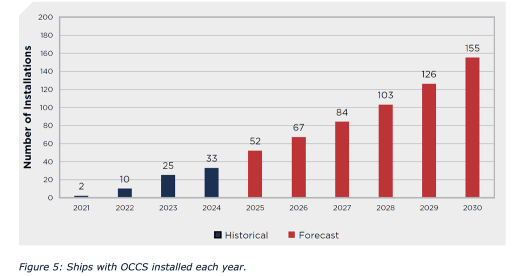 Onboard Carbon Capture and Storage (OCCS), whose application is also expected to grow in the coming years (Figure 5), particularly in mature configurations like amine-based post-combustion and oxyfuel precombustion systems, offers significant potential to decouple greenhouse gas emissions from maritime trade volumes.